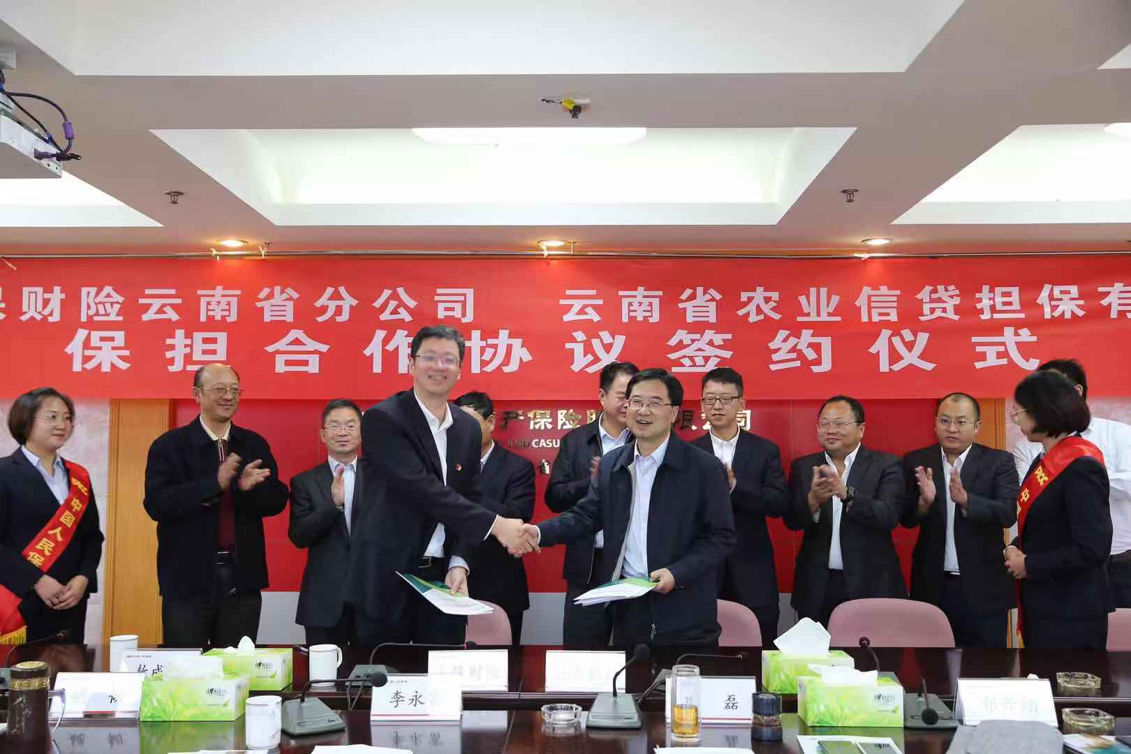10月19日下午,公司與中國人保財險云南省分公司舉行了保擔合作協(xié)議簽約儀式。公司郭影董事長、杜開波總經理、敖成碧副總經理、人保財險云南省分公司黨委書記、總經理雙磊、副總經理李永富出席儀式,雙方有關部門負責人參加了活動。