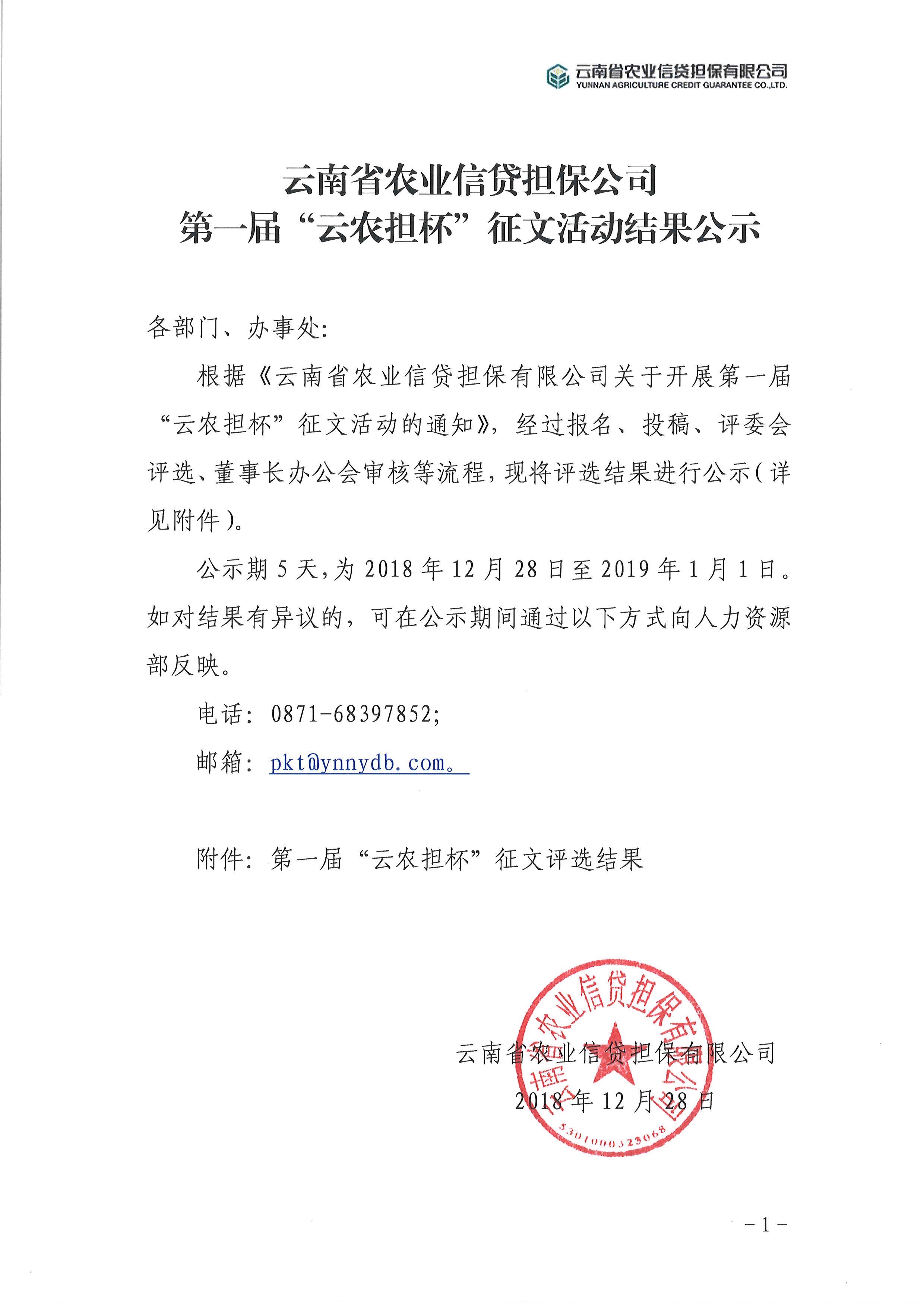 云南省農(nóng)業(yè)信貸擔(dān)保公司第一屆“云農(nóng)擔(dān)杯”征文活動結(jié)果公示各部門、辦事處: