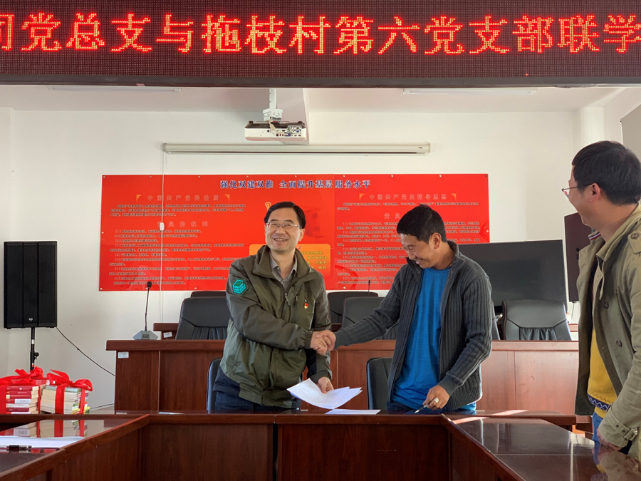 支部結對雙促進,共建共享強黨建。自公司黨組織成立以來,嚴格按照省財政廳機關黨委扶貧工作要求,農(nóng)擔公司黨(總)支部與永春鄉(xiāng)拖枝村第六黨支部開展了支部共建“雙一雙”學習教育、經(jīng)驗交流,10月22日公司黨總支書記郭影與拖枝村第六簽訂了黨支部結對共建協(xié)議書,并捐贈黨建和農(nóng)業(yè)科技方面讀書,把黨建工作與精準扶貧工作相結合,充分發(fā)揮農(nóng)擔公司黨組織全心支農(nóng)、為農(nóng)、惠農(nóng)、不脫農(nóng)的先鋒模范作用,以黨建推動脫貧攻堅,以脫貧攻堅促進支部黨建,促進了扶貧工作與黨建工作的良性互動。