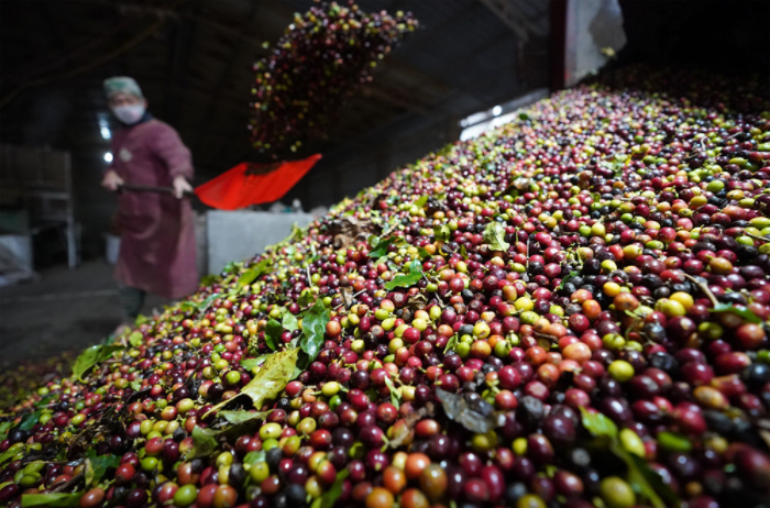 這2月22日在云南普洱市一家咖啡生產(chǎn)企業(yè)內(nèi)拍攝的新收購并準(zhǔn)備進(jìn)行處理的咖啡鮮果。新華社記者 陳欣波 攝