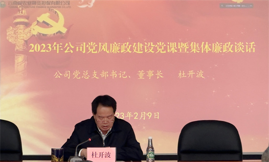 2月9日,云南省農(nóng)業(yè)融資擔(dān)保有限公黨總支部書記、董事長杜開波在公司年度工作會(huì)議上,為全體職工上了一堂黨風(fēng)廉政建設(shè)專題黨課,并作集體廉政談話。省公司全體職工、州市分支機(jī)構(gòu)負(fù)責(zé)人、主管等現(xiàn)場聽課,各州市分支機(jī)構(gòu)全員通過視頻方式聽課。